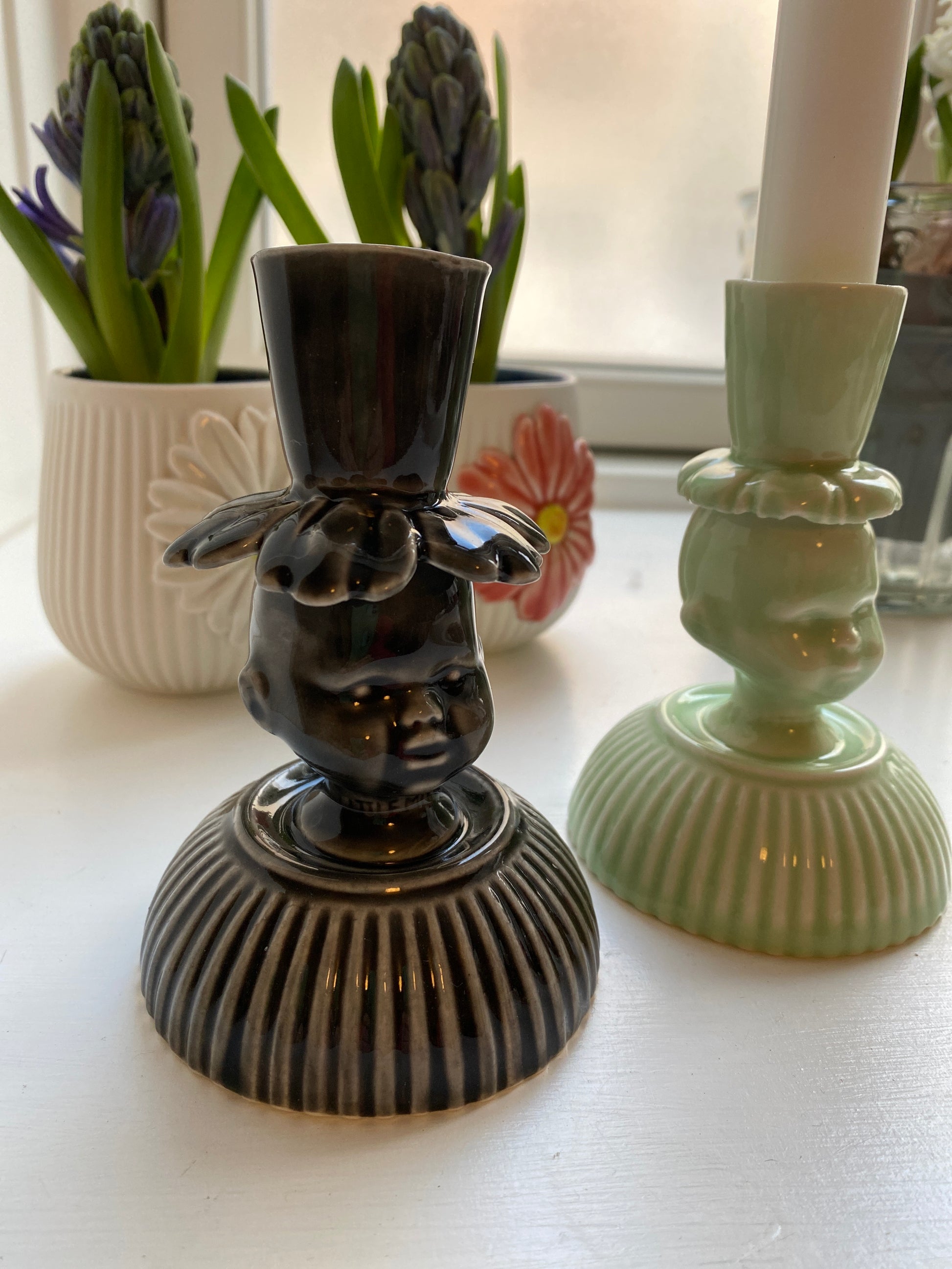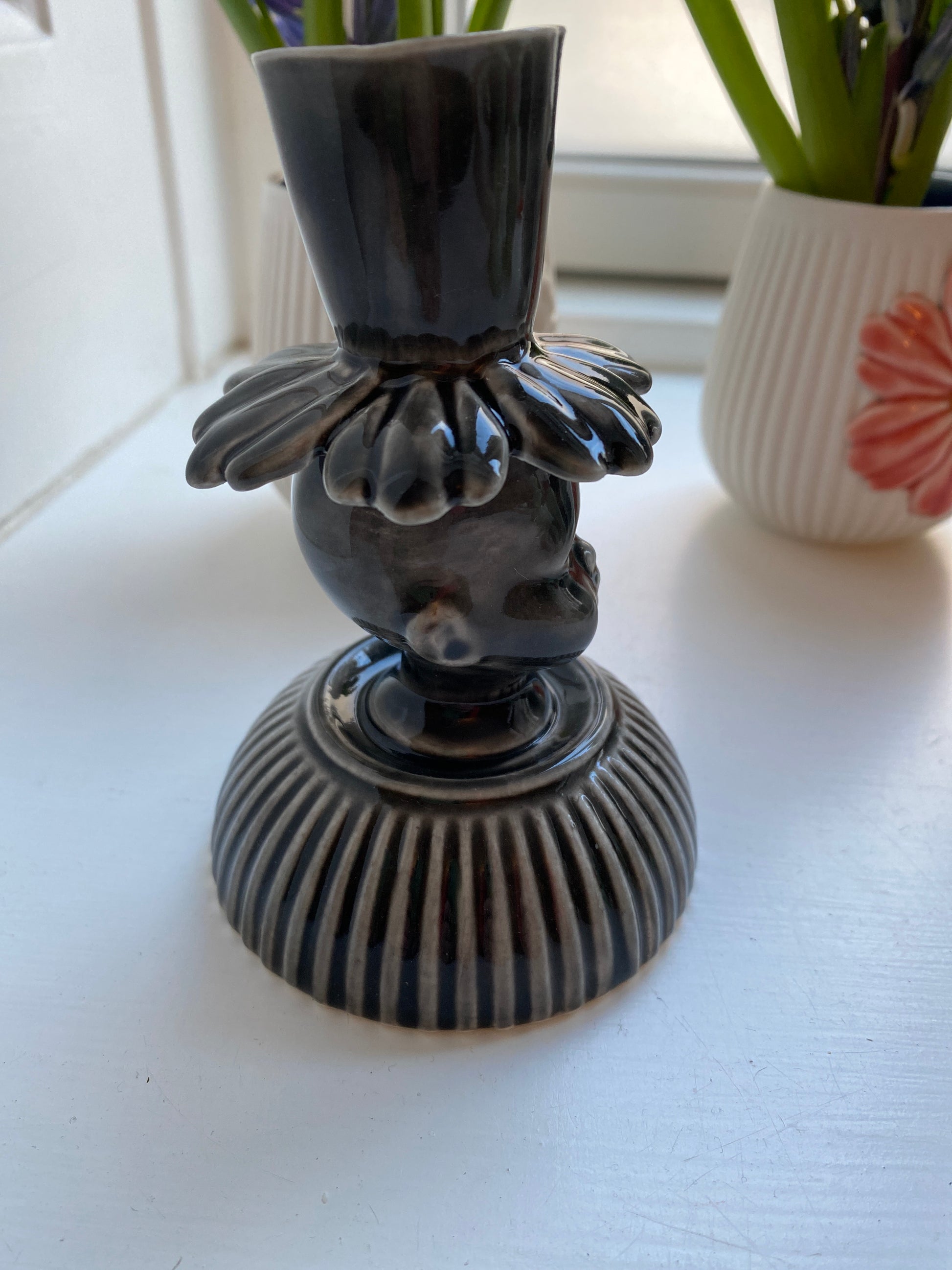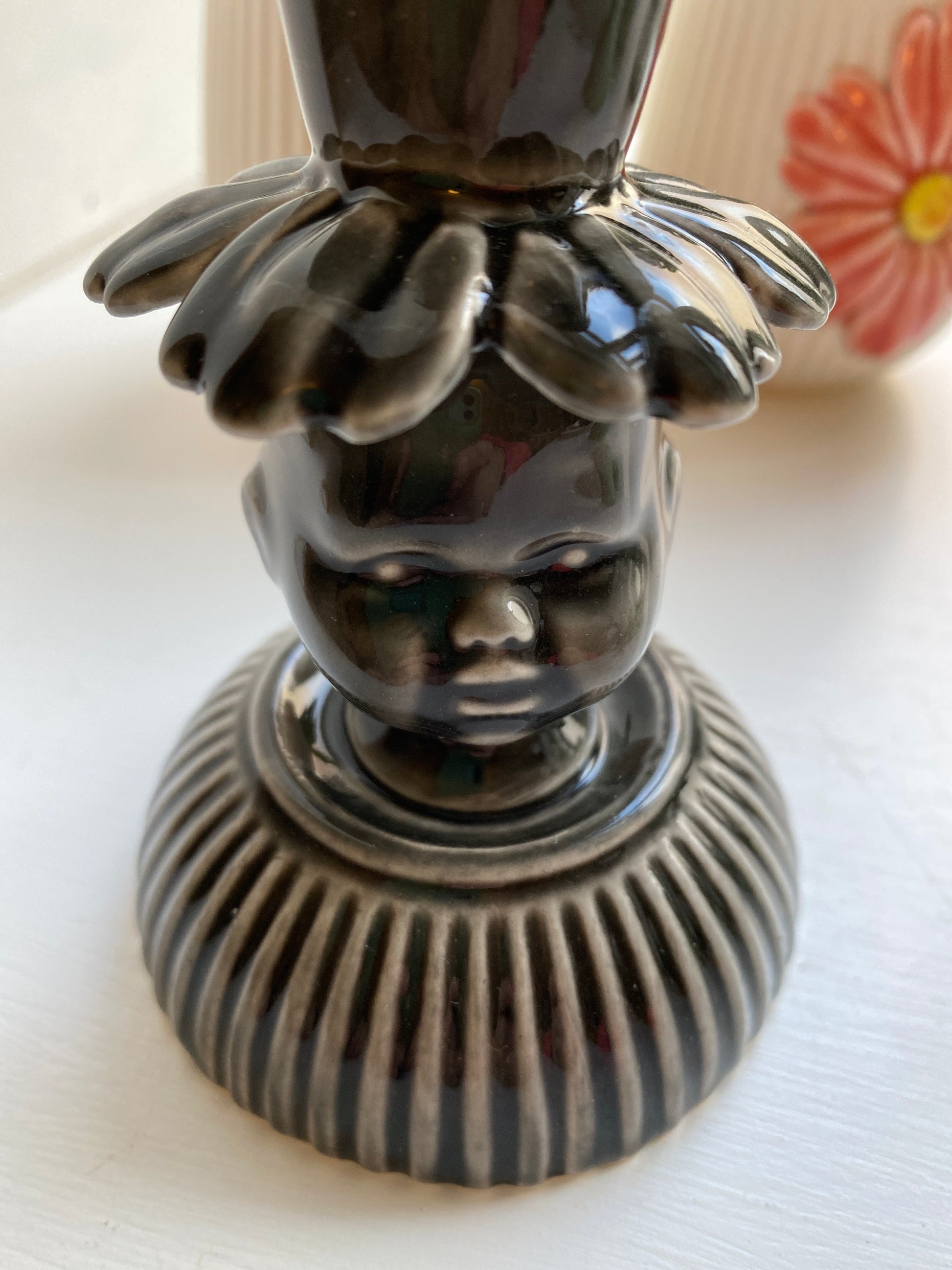 Stage med dukkehoved i porcelæn. 9,5 fine cm i sort / grå nuancer.