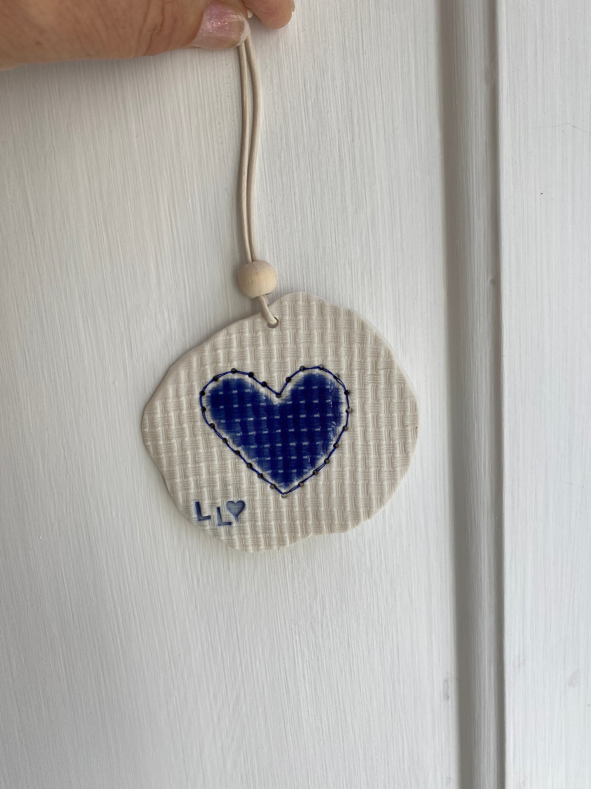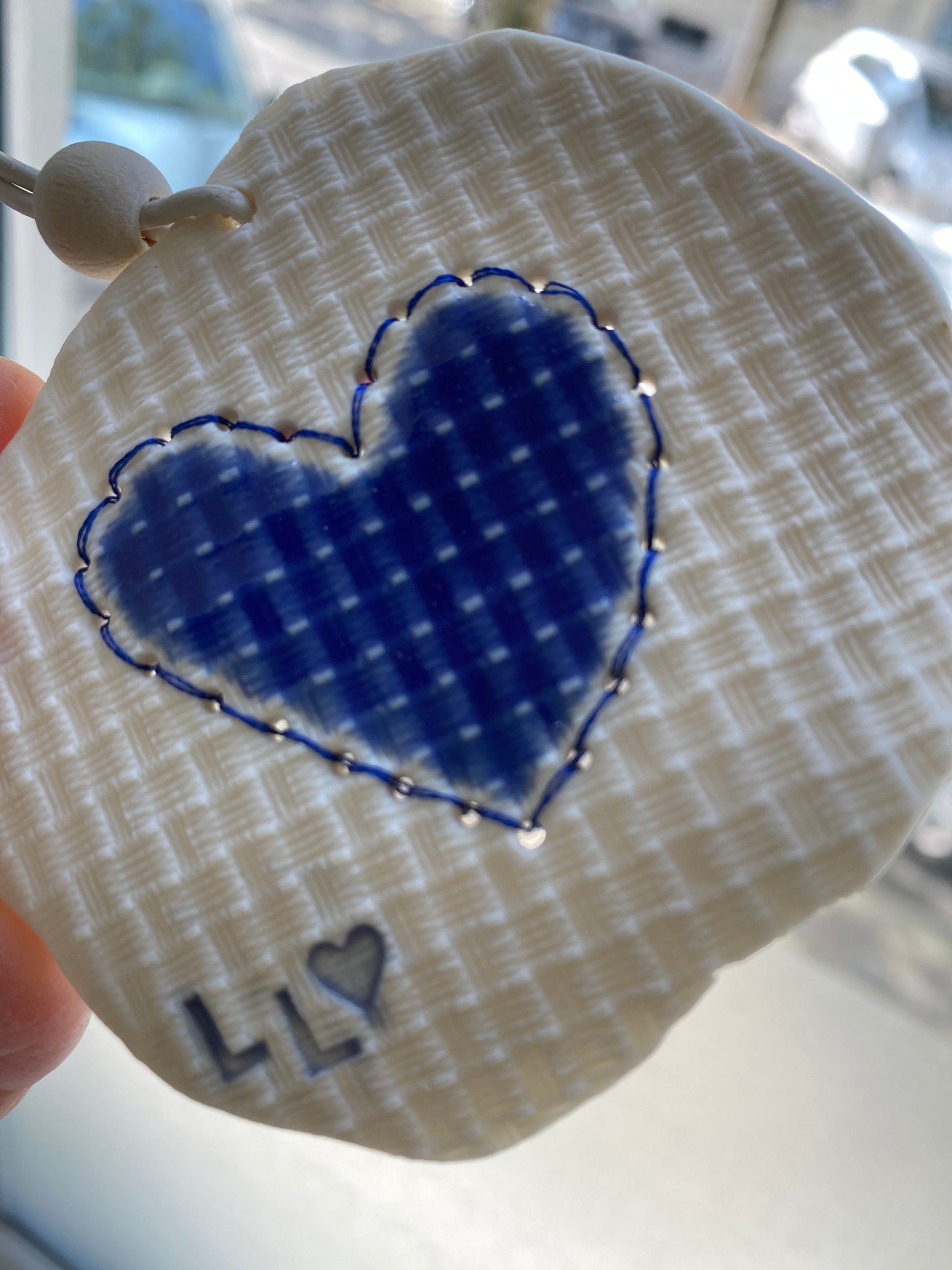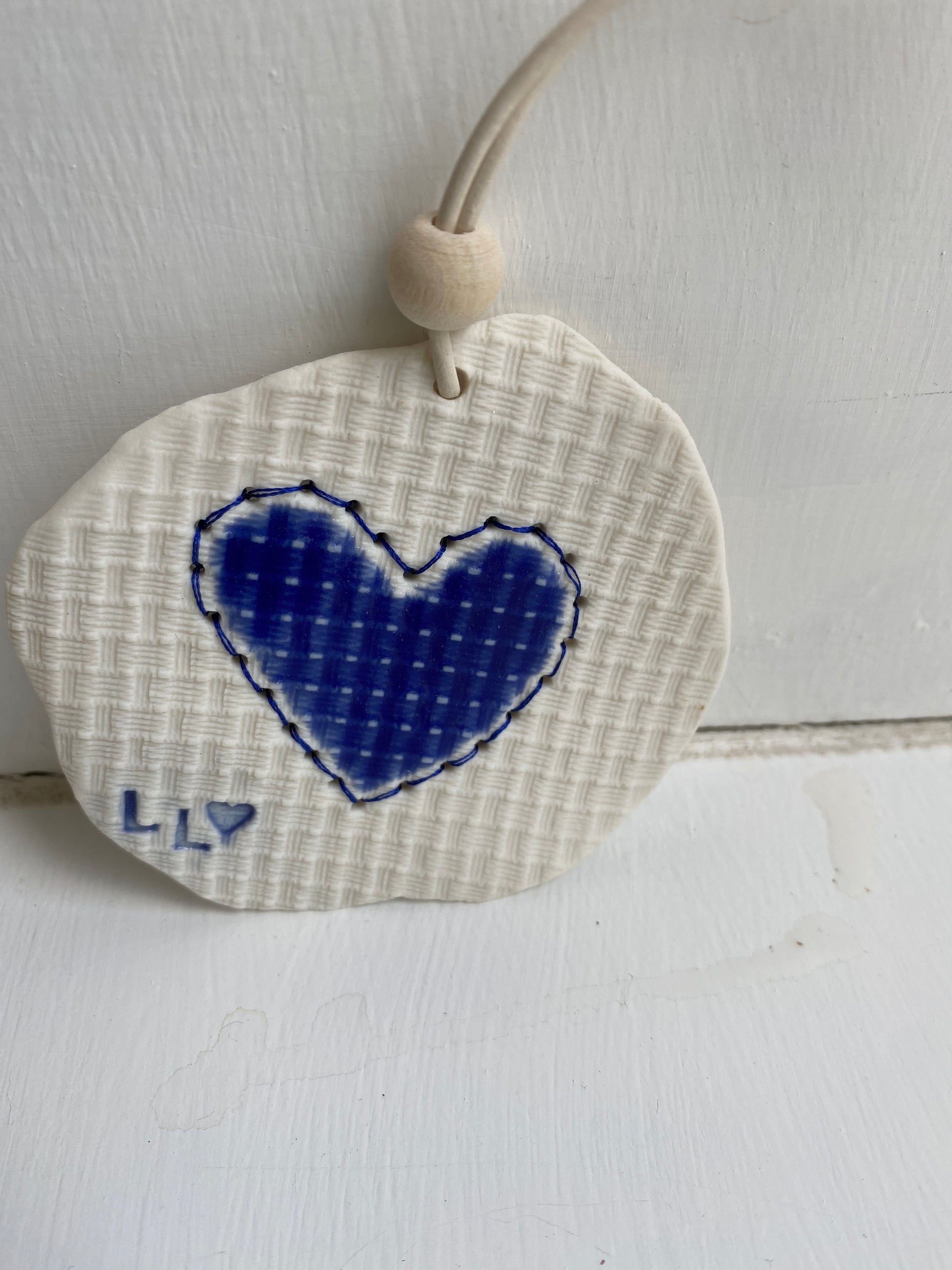 Porcelænsler, nål og tråd. Ophæng