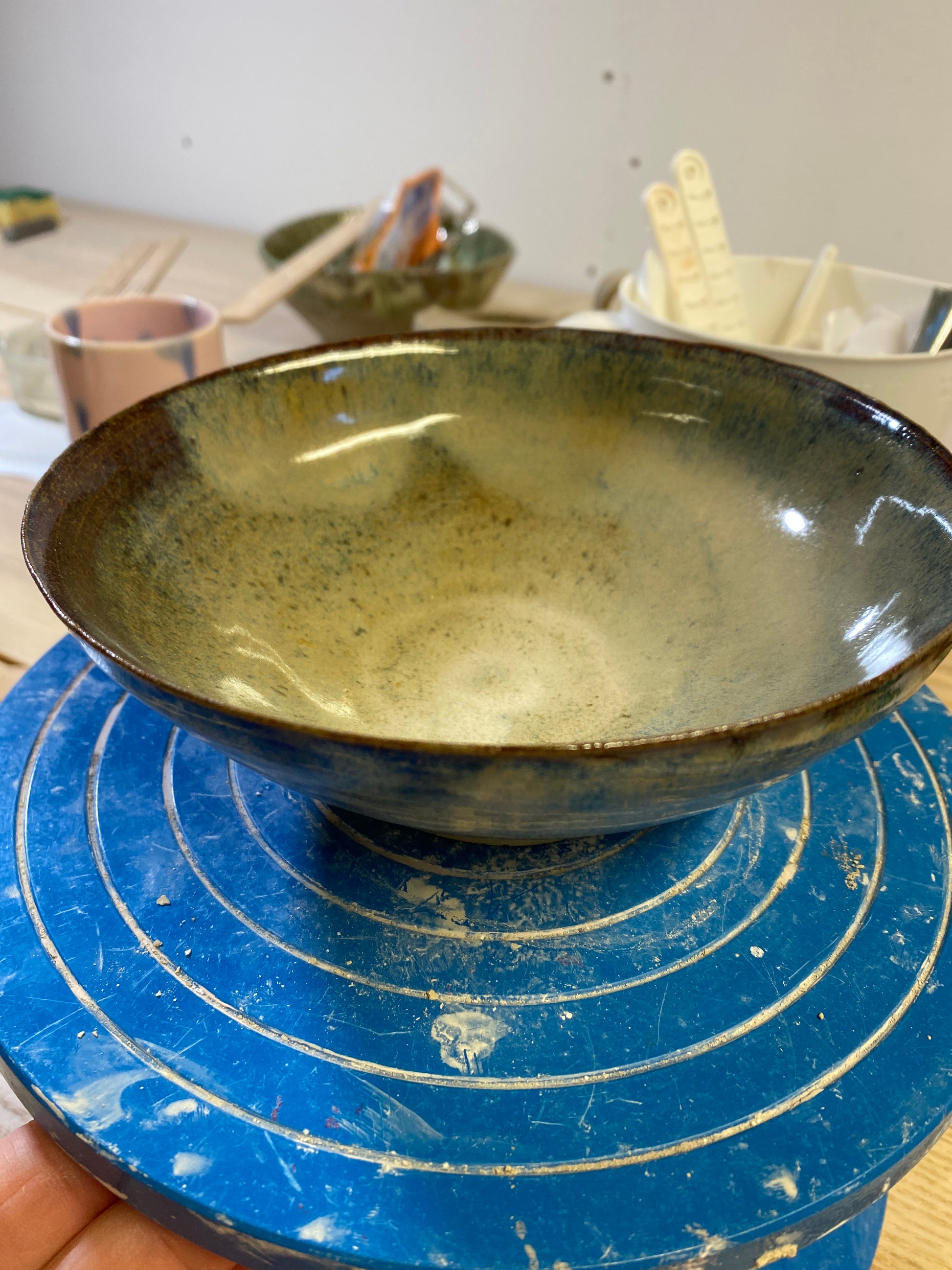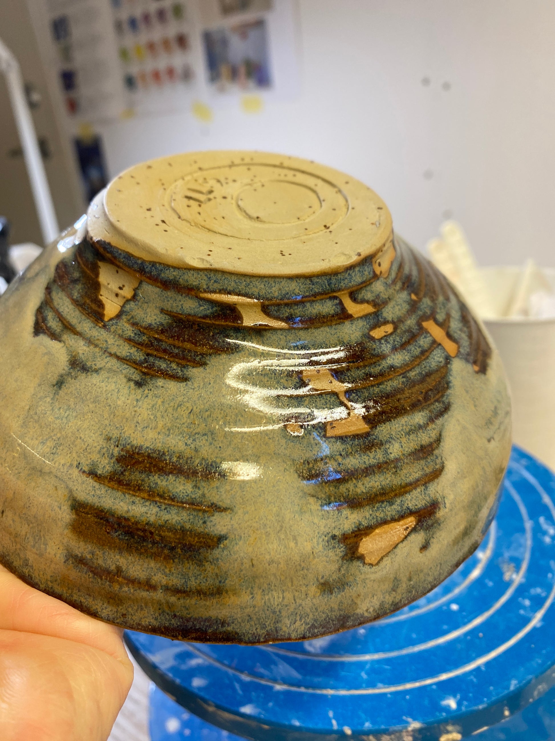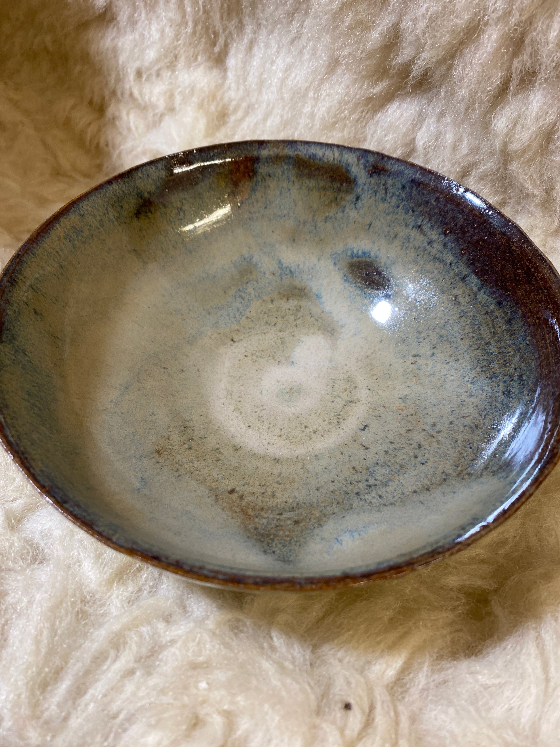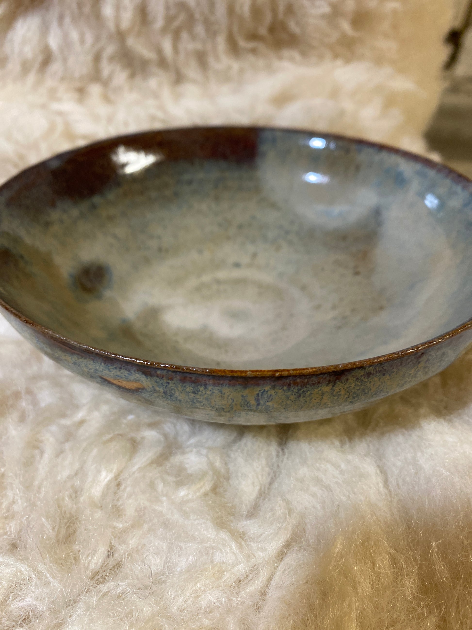 Brune, grå, beige og blå farver. Ca 3.5 dl